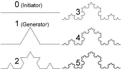 Das oft auch "Scheeflockenkurve" genannte Fraktal, das Helge von Koch 1904 entdeckte, eröffnet gute Möglichkeiten zur Beschreibung der fraktalen Eigenschaften. Man erhält diese Kurve, wie die meisten Fraktale, indem man einen Ersetzungsvorgang immer wieder durchführt, theoretisch sogar unendlich oft. Dieses Wiederholen eines Vorgangs wird auch als "Iteration" bezeichnet (lat. iterum = wiederum). In diesem konkreten Fall wird eine einfache Linie ("Initiator") durch eine Figur aus vier Linien ("Generator") ersetzt: